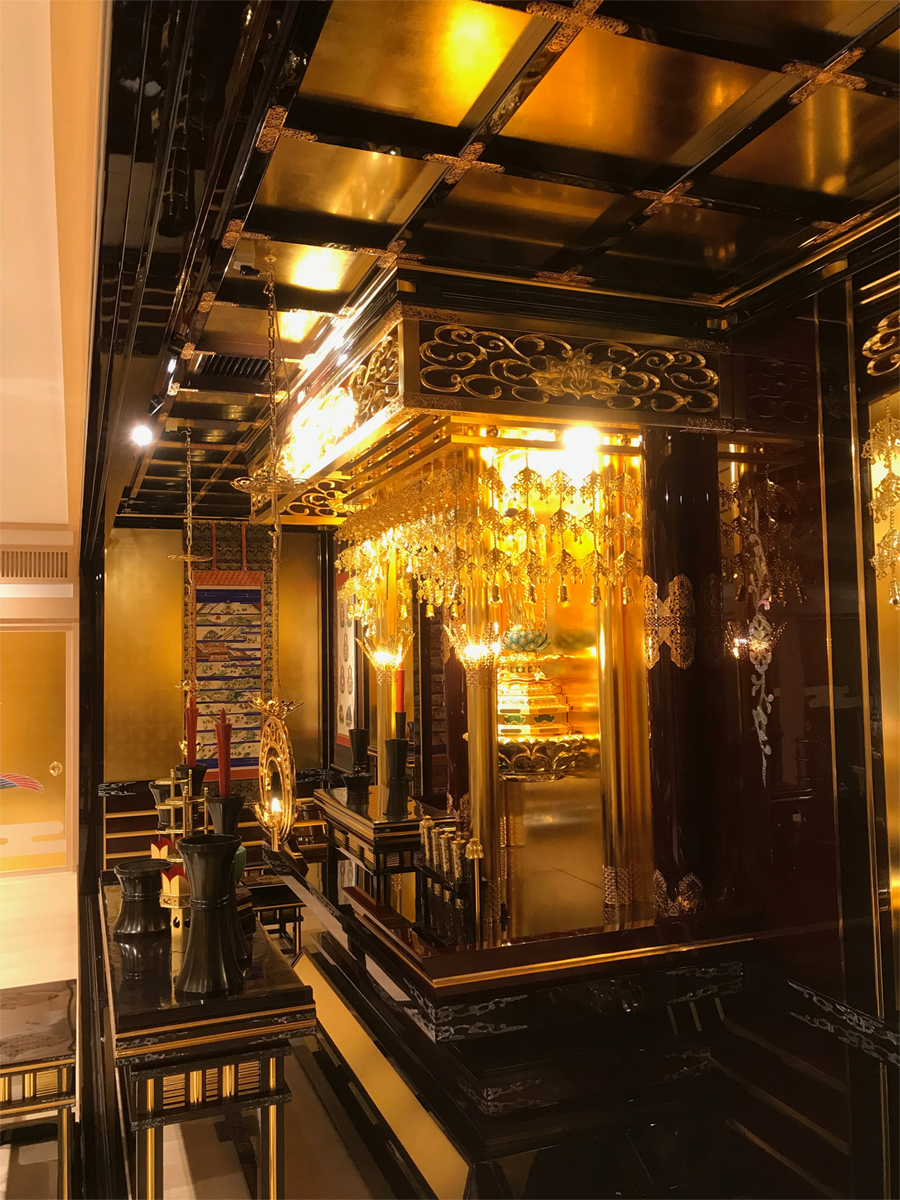 都内目黒駅近くにオープンした地下1階、地上3階建ての納骨堂です。アドノスは3階本堂施工工事、3階法要室ご荘厳、地下1階法要室ご荘厳、地下1階合祀墓ご荘厳、各階参拝室ご荘厳具足(石製)の納入の栄誉を賜りました。都内の寺院としては本堂中尊ご荘厳に螺鈿仕上げの最高品質の施工作業をさせて頂きました。また、本堂外陣の左右戸襖には、純金箔押し仕上げの部分へ桐に鳳凰柄の極彩色を施した豪華絢爛な本堂となっています。本堂中尊のご荘厳仏具については、全てオリジナルデザインのお仏具を納入させて頂きました。中尊部分の巻障子についても螺鈿仕様のオリジナルデザインとなっています。